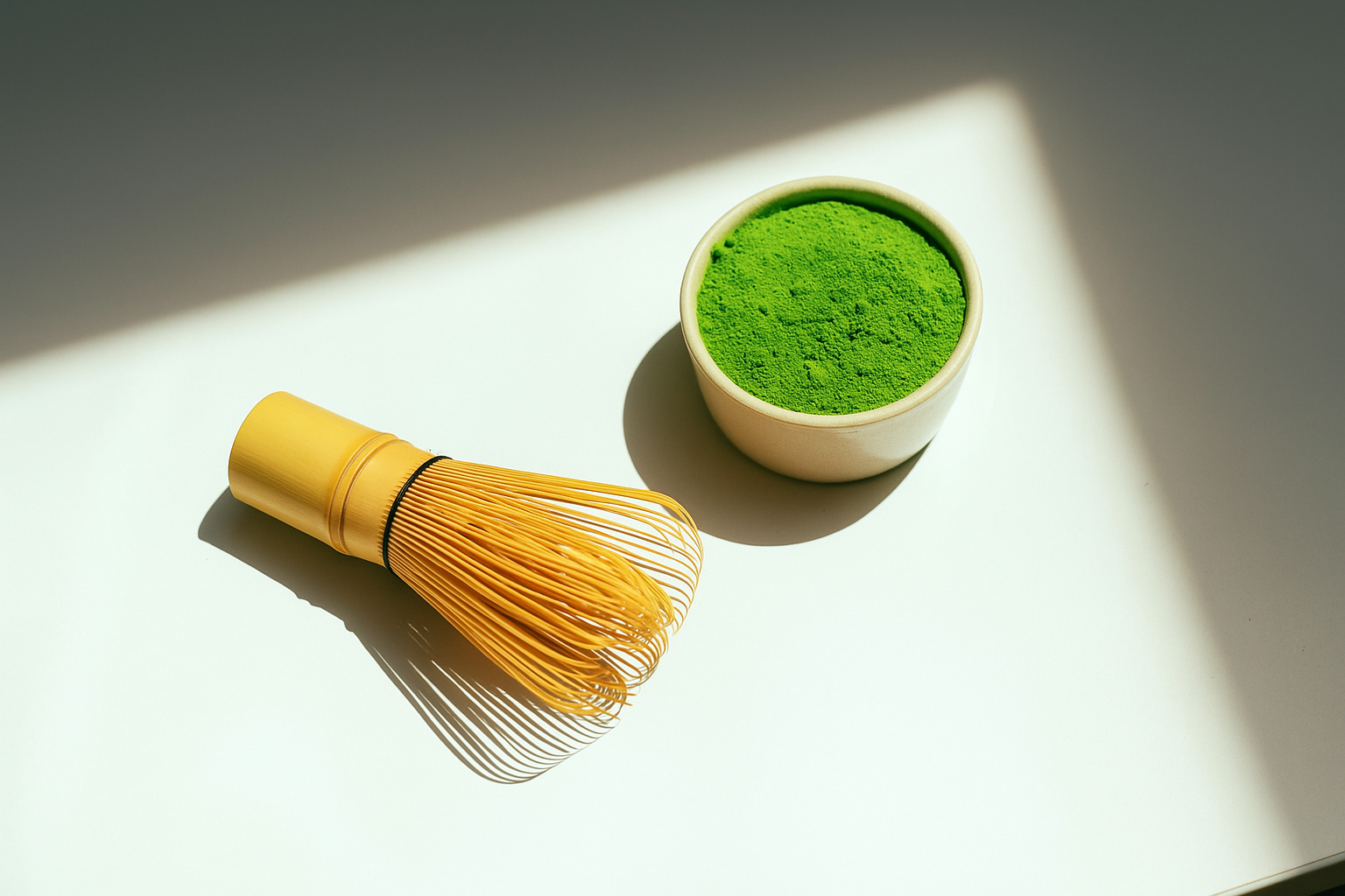 1–2 g Matcha + 60–80 ml Wasser (ca. 80 °C) → mit dem Bambusbesen (Chasen) schaumig schlagen. That’s it.