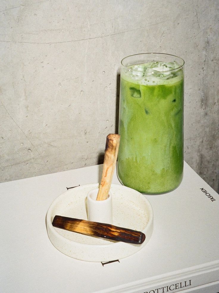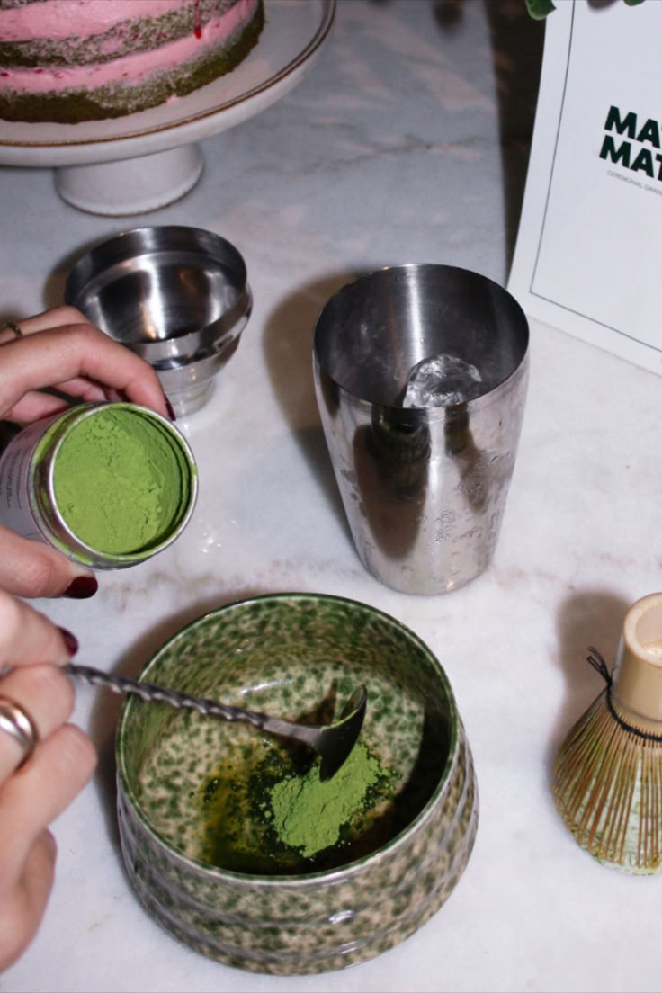 1–2 g Matcha + 60–80 ml Wasser (ca. 80 °C) → mit dem Bambusbesen (Chasen) schaumig schlagen. That’s it.